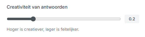 - Creativiteit van antwoorden: Pas de creativiteit slider aan op basis van hoe creatief je wilt dat Bytechat de vragen beantwoordt. We raden aan om de creativiteit op 0.2 in te stellen, zodat Bytechat feitelijk blijft en geen antwoorden geeft die niet in de bronnen staan. Een hogere waarde kan creatiever en minder saai overkomen. Speel gerust met deze instelling om een waarde te vinden die bij je past.