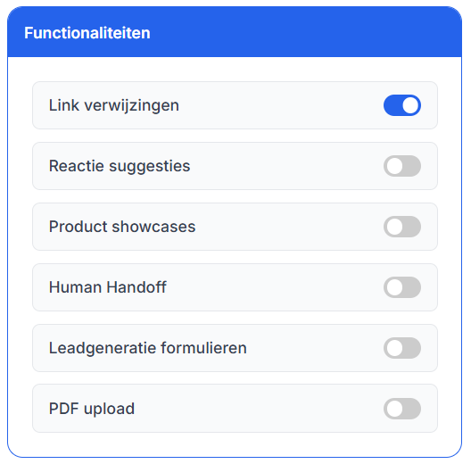 - PDF upload: Stelt gebruikers in staat om een PDF-bestand te uploaden en hier direct vragen over te stellen in de chat. Meer informatie over PDF upload
